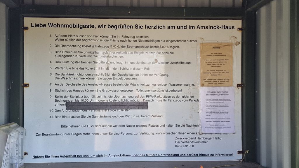 Direkt am Amsinck-Haus (Sönke-Nissen-Koog 36a) befindet sich ein offizieller Wohnmobilstellplatz. Er ist ideal für alle, die morgens als Erste die Stille des Deichs genießen wollen.