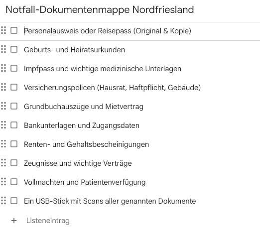 Tipp: In Nordfriesland wird empfohlen, immer eine „Notfallmappe“ mit Kopien der wichtigsten Dokumente (Ausweis, Versicherung, Urkunden) griffbereit zu haben, falls eine Evakuierung (z.B. wegen einer schweren Sturmflut) nötig wird.